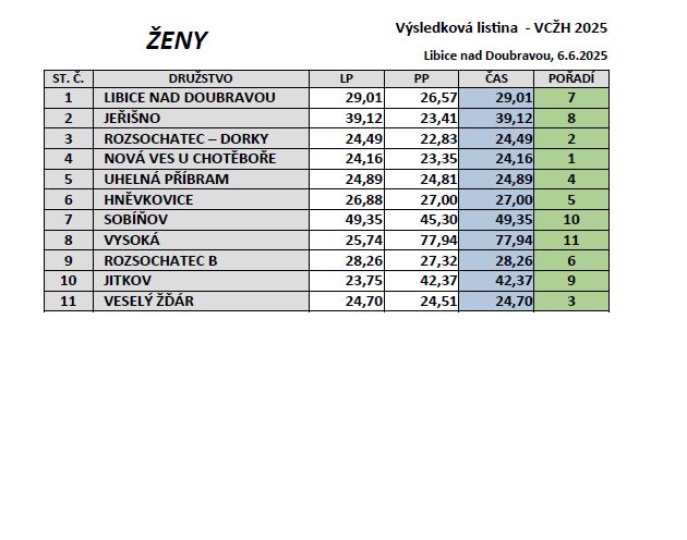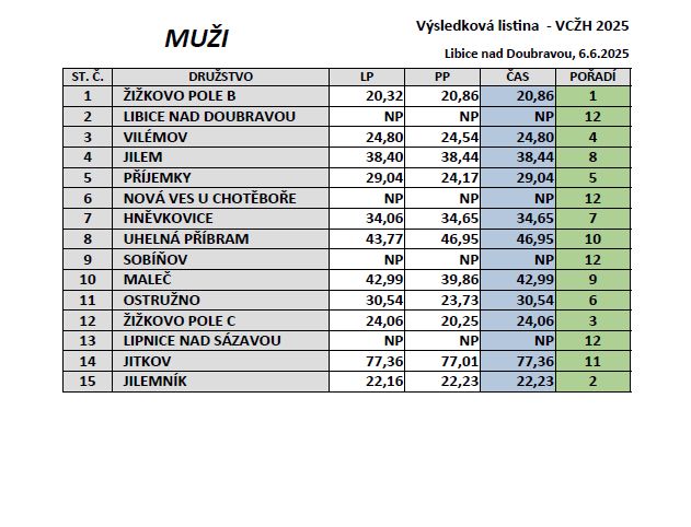 Výsledková listina 13. ročníku noční soutěže v požárním útoku VELKÁ CENA ŽELEZNÝCH HOR 2025 (6.6.2025, Libice n/D).